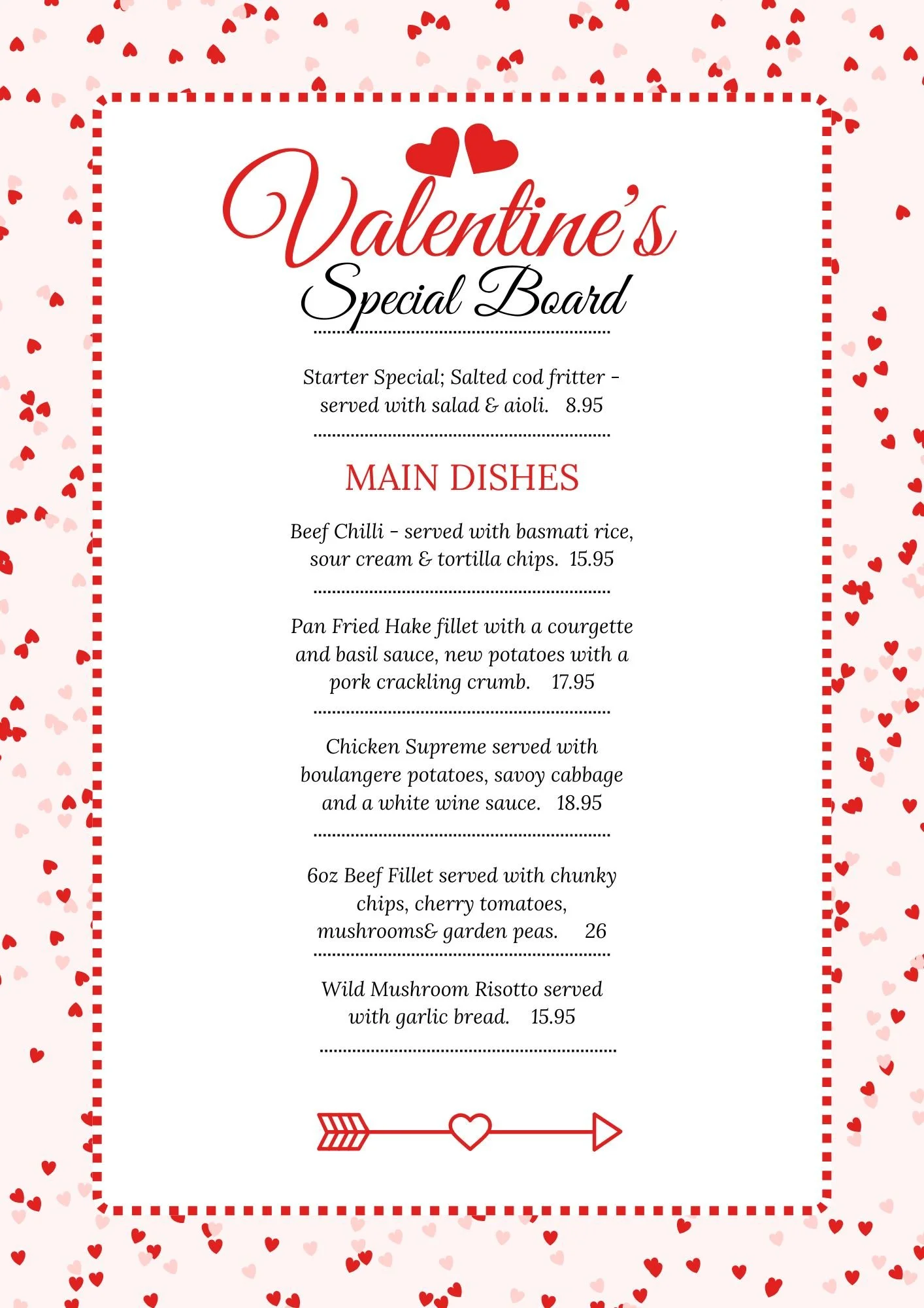 Valentine Special Board will run alongside our main and children’s menu. Please let us aware of any dietary requirements.